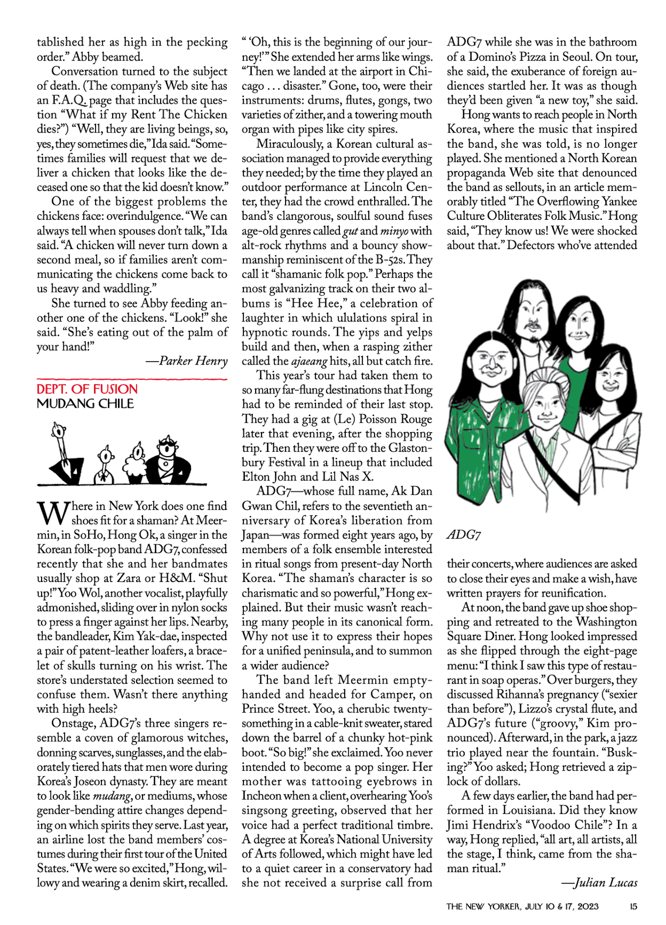 The band’s clangorous, soulful sound fuses age-old genres called gut and minyo with alt-rock rhythms and a bouncy showmanship reminiscent of the B-52s. They call it “shamanic folk pop.” Perhaps the most galvanizing track on their two albums is “Hee Hee,” a celebration of laughter in which ululations spiral in hypnotic rounds. The yips and yelps build and then, when a rasping zither called the ajaeang hits, all but catch fire.