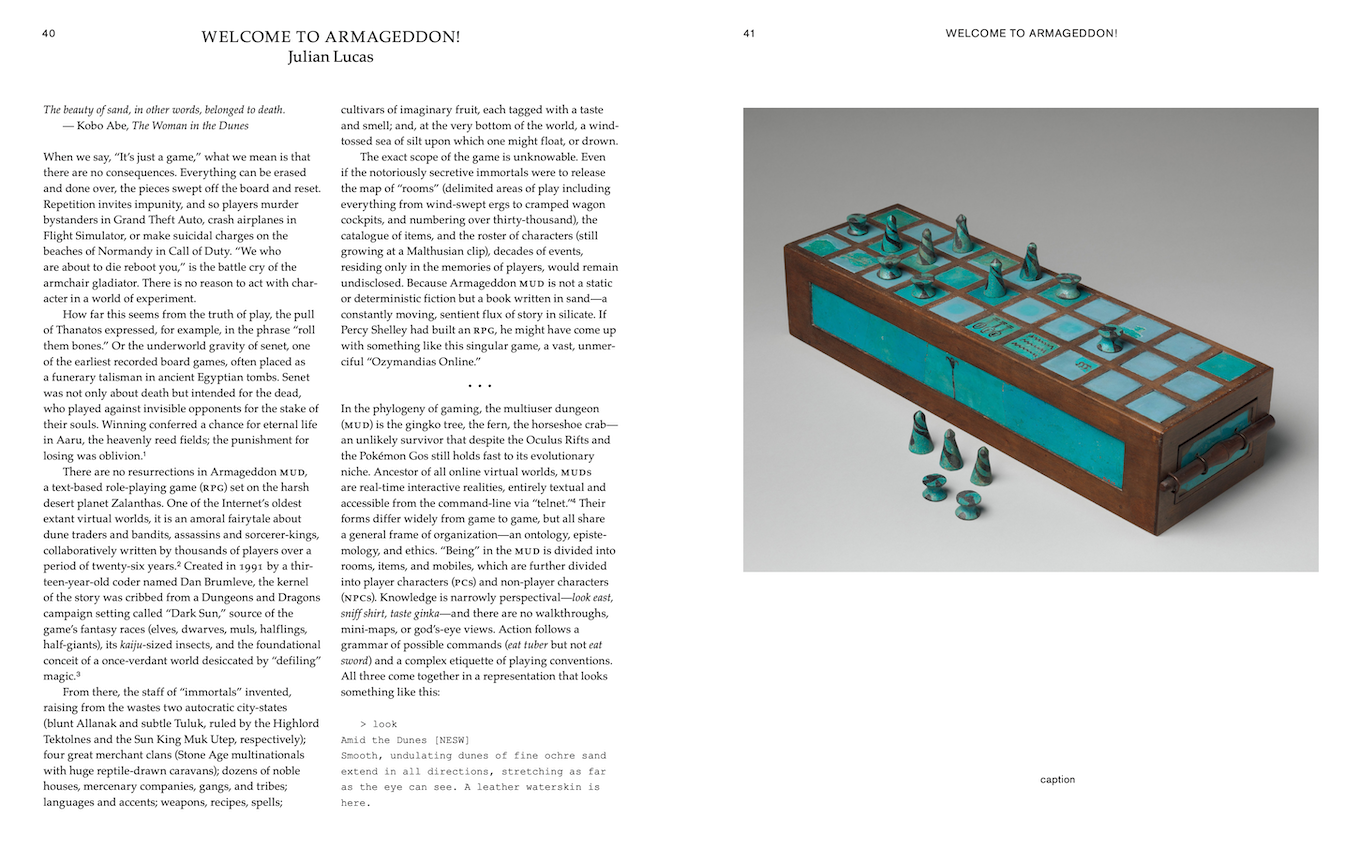 When we say, “It’s just a game,” what we mean is that there are no consequences [ . . . ] How far this seems from the truth of play, the pull of Thanatos expressed, for example, in the phrase “roll them bones.” Or the underworld gravity of senet, one of the earliest recorded board games, often placed as a funerary talisman in ancient Egyptian tombs. Senet was not only about death but intended for the dead, who played against invisible opponents for the stake of their souls. Winning conferred a chance for eternal life in Aaru, the heavenly reed fields; the punishment for losing was oblivion.