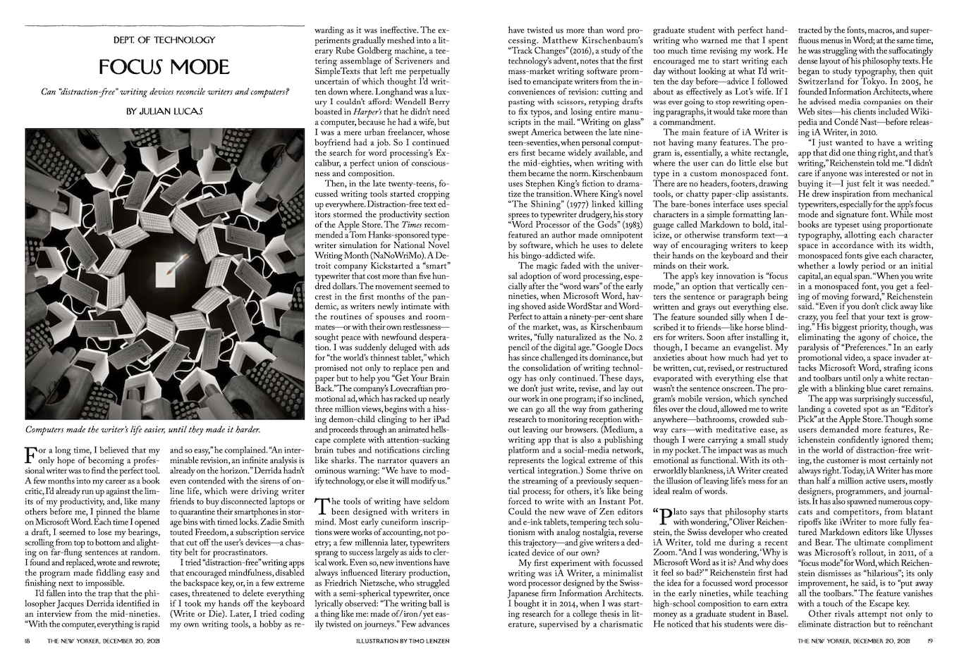 But focus mode on an everything device is a meditation room in a casino. What good is it to separate writing from editing, formatting, and cluttered interfaces if you can’t separate it from the Internet? Even a disconnected computer offers plenty of opportunities for distraction: old photographs, downloaded music, or, most treacherous of all, one’s own research. And so, just as savvy entrepreneurs have resuscitated the “dumb” phone as a premium single-tasking communication device, it was perhaps inevitable that someone would revive the stand-alone word processor.
