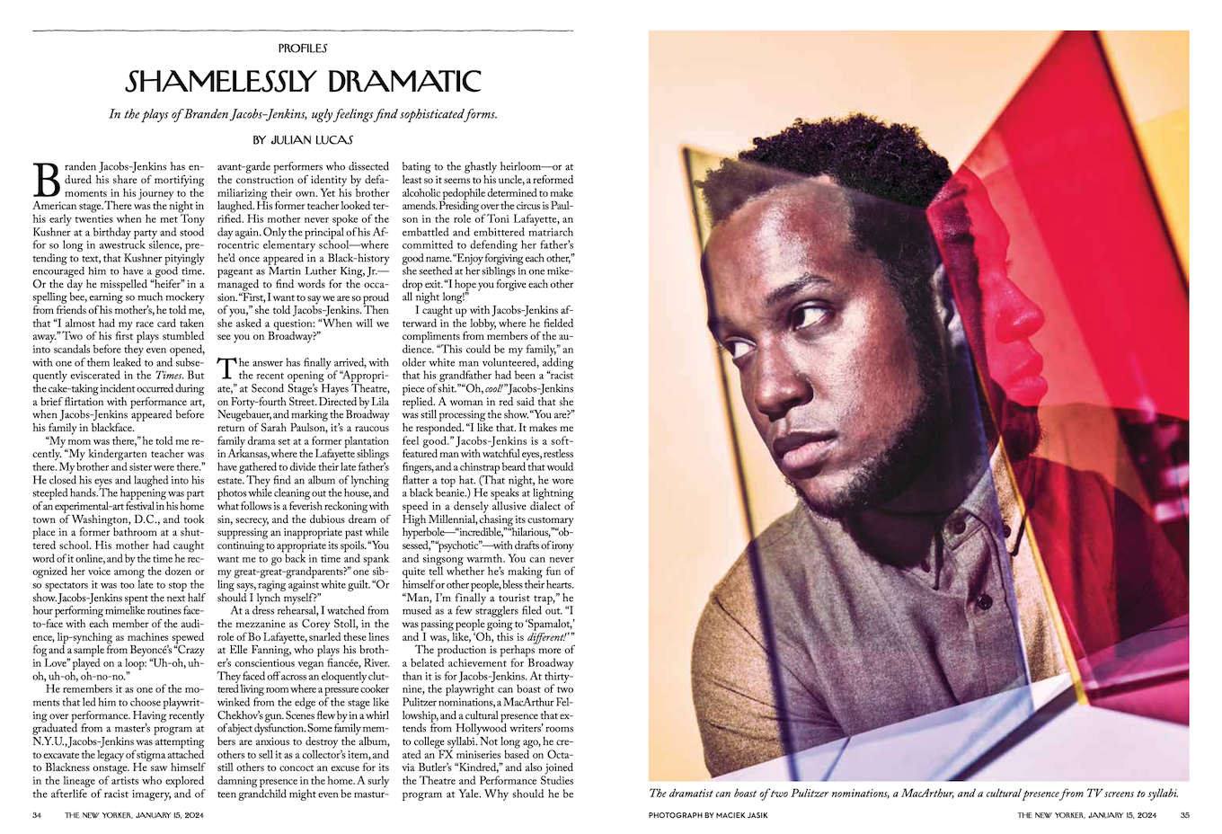 There’s a generational valence to his fixation on the embarrassment of living—a millennial complaint about the awkwardness of having been groomed for plum roles in an end-of-history pageant that never came to be. In “Gloria” (2015), set at a magazine whose young staffers blame “post-war glutton babies” for squandering their futures, a copy editor feels so disgraced by the low attendance at her housewarming party that she shoots up the office. “Girls” (2019), an adaptation of “The Bacchae,” reimagines Euripides’ uptight king as an incel streamer maddened by his parents’ boomerish decadence. Jacobs-Jenkins’s keen ear for the anxieties of our age is equally attuned to those of ages gone by; in adaptations like “An Octoroon” and “Everybody” (2017), based on a medieval morality play, the shock of self-consciousness summons the ghosts of theatre’s history. “I cringe at my past,” he joked in one of our conversations. Yet what is cringe but the beginning of self-knowledge?