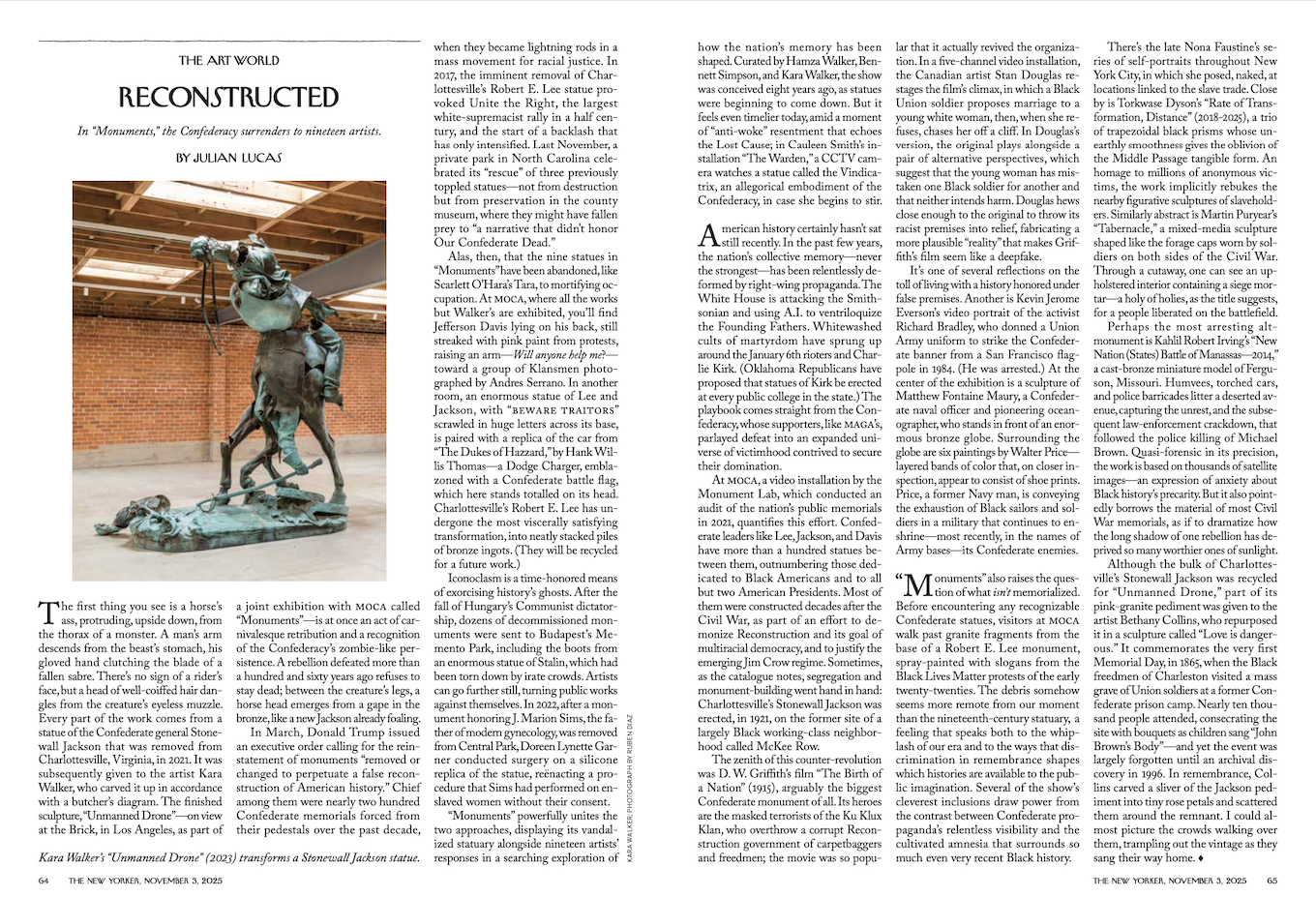 “Reconstructed,” The New Yorker, October 24, 2025:Alas, then, that the nine statues in “Monuments” have been abandoned, like Scarlett O’Hara’s Tara, to mortifying occupation. At MOCA, where all the works but Walker’s are exhibited, you’ll find Jefferson Davis lying on his back, still streaked with pink paint from protests, raising an arm—Will anyone help me?—toward a group of Klansmen photographed by Andres Serrano. In another room, an enormous statue of Lee and Jackson, with “BEWARE TRAITORS” scrawled in huge letters across its base, is paired with a replica of the car from “The Dukes of Hazzard,” by Hank Willis Thomas—a Dodge Charger, emblazoned with a Confederate battle flag, which here stands totalled on its head. Charlottesville’s Robert E. Lee has undergone the most viscerally satisfying transformation, into neatly stacked piles of bronze ingots. (They will be recycled for a future work.)