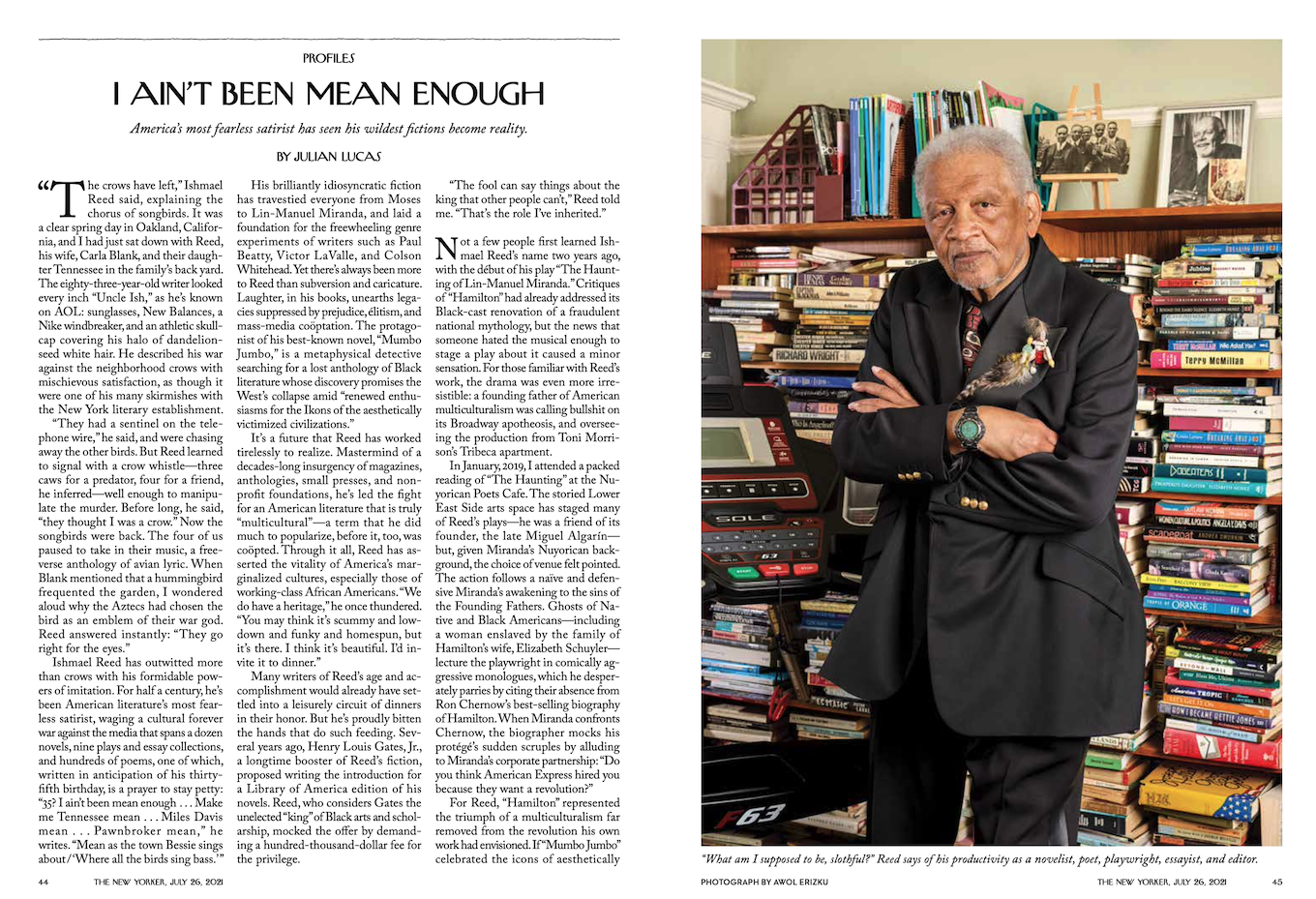 His brilliantly idiosyncratic fiction has travestied everyone from Moses to Lin-Manuel Miranda, and laid a foundation for the freewheeling genre experiments of writers such as Paul Beatty, Victor LaValle, and Colson Whitehead. Yet there’s always been more to Reed than subversion and caricature. Laughter, in his books, unearths legacies suppressed by prejudice, élitism, and mass-media coöptation. The protagonist of his best-known novel, “Mumbo Jumbo,” is a metaphysical detective searching for a lost anthology of Black literature whose discovery promises the West’s collapse amid “renewed enthusiasms for the Ikons of the aesthetically victimized civilizations.”