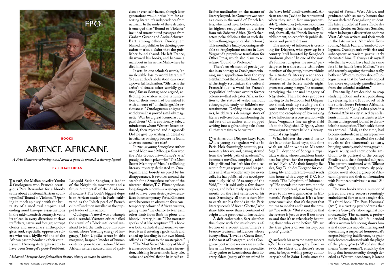 There’s an element of poetic justice in an homage to Ouologuem winning such approbation from the very establishment that discarded him. Sarr witheringly scrutinizes the cultural Françafrique—a word for France’s geopolitical influence over its former colonies—that relegates African fiction to the status of veiled memoir, ethnographic study, or folkloric entertainment. Defying these categories, he delivers a demiurgic story of literary self-creation, transforming the sad fate of an author who stopped writing into a galvanizing tale about all that remains to be written.