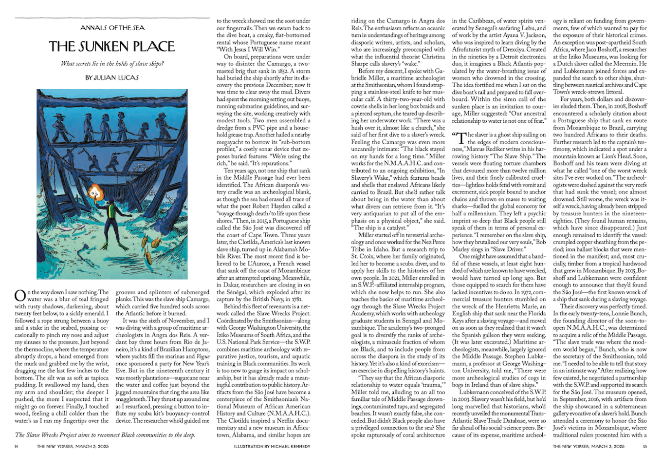 On the way down I saw nothing. The water was a blur of teal fringed with rusty shadows, darkening, about twenty feet below, to a sickly emerald. I followed a rope strung between a buoy and a stake in the seabed, pausing occasionally to pinch my nose and adjust my sinuses to the pressure. Just beyond the thermocline, where the temperature abruptly drops, a hand emerged from the murk and grabbed me by the wrist, dragging me the last few inches to the bottom. The silt was as soft as tapioca pudding. It swallowed my hand, then my arm and shoulder; the deeper I pushed, the more I suspected that it might go on forever. Finally, I touched wood, feeling a chill colder than the water’s as I ran my fingertips over the grooves and splinters of submerged planks. This was the slave ship Camargo, which carried five hundred souls across the Atlantic before it burned.