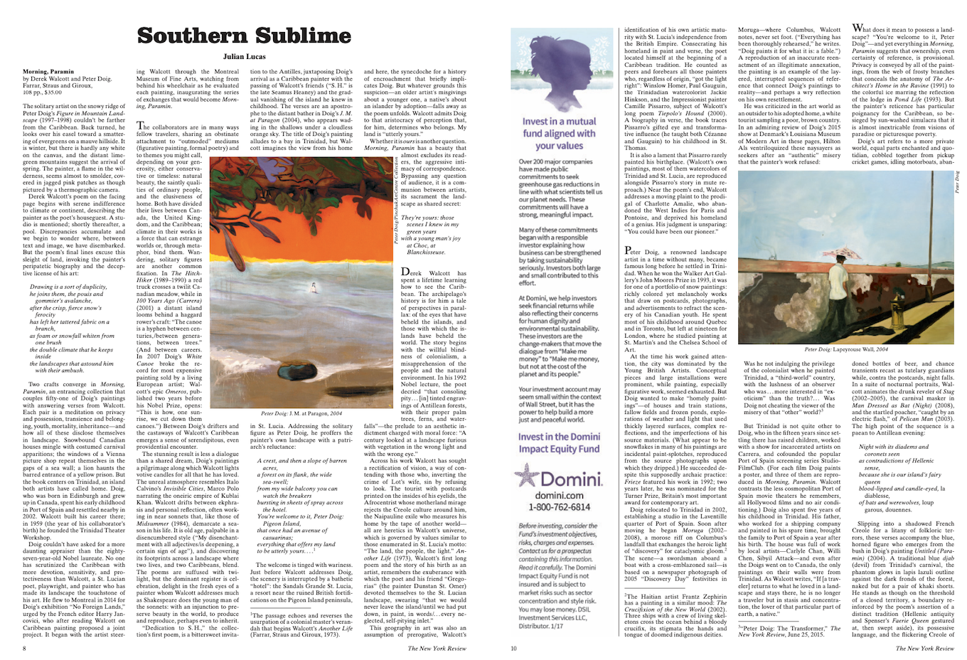 Two crafts converge in Morning, Paramin, an entrancing collection that couples fifty-one of Doig’s paintings with answering verses from Walcott. Each pair is a meditation on privacy and possession, transience and belonging, youth, mortality, inheritance—and how all of these disclose themselves in landscape. Snowbound Canadian houses mingle with costumed carnival apparitions; the windows of a Vienna picture shop repeat themselves in the gaps of a sea wall; a lion haunts the barred entrance of a yellow prison. But the book centers on Trinidad, an island both artists have called home. Doig, who was born in Edinburgh and grew up in Canada, spent his early childhood in Port of Spain and resettled nearby in 2002. Walcott built his career there; in 1959 (the year of his collaborator’s birth) he founded the Trinidad Theater Workshop.